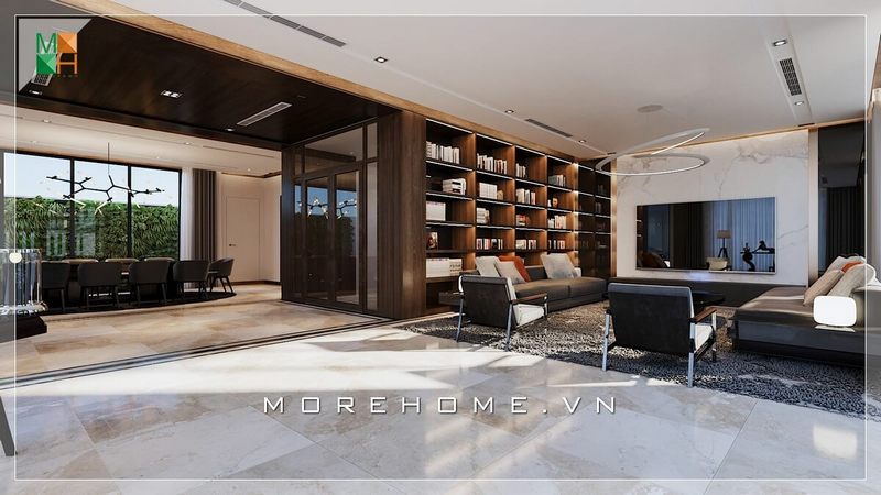 Thiết kế nội thất hiện đại từ sofa, kệ tủ,... và sự thông thoáng rộng mở của không gian tạo nên vẻ đẹp thu hút, ấn tượng cho ngôi biệt thự, nhà phố