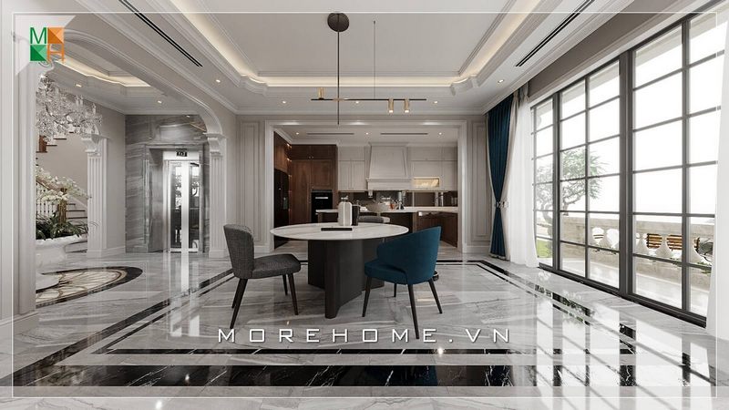 Choáng ngợp trong không gian phòng ăn rộng lớn được lát đá cao cấp và nội thất tủ gỗ óc chó ấn tượng của biệt thự, nhà phố.