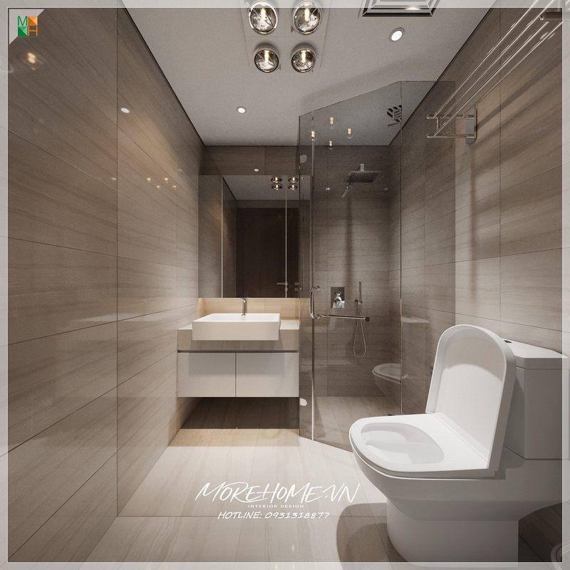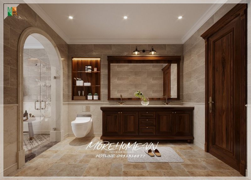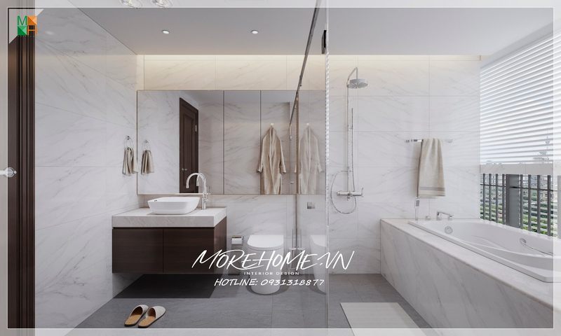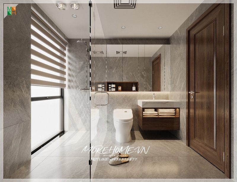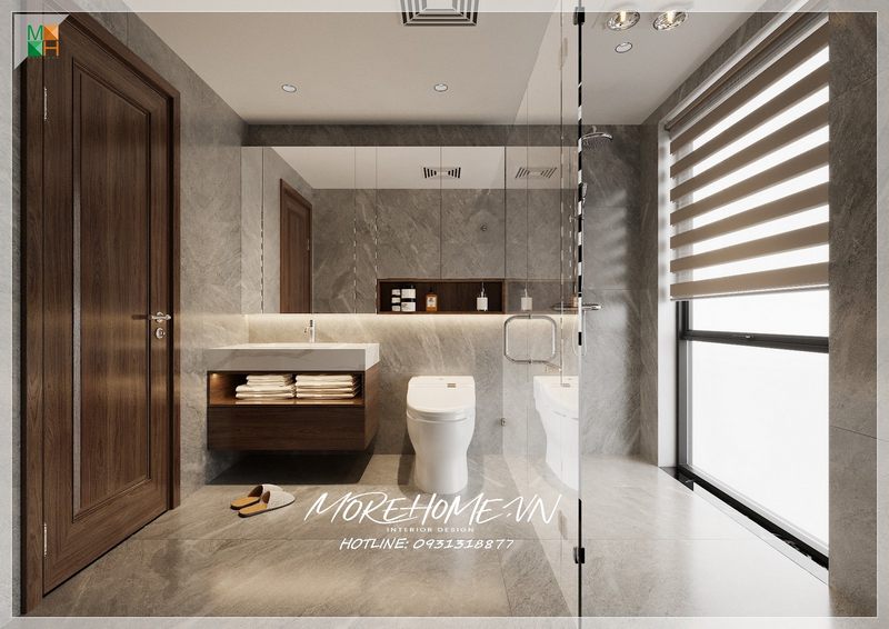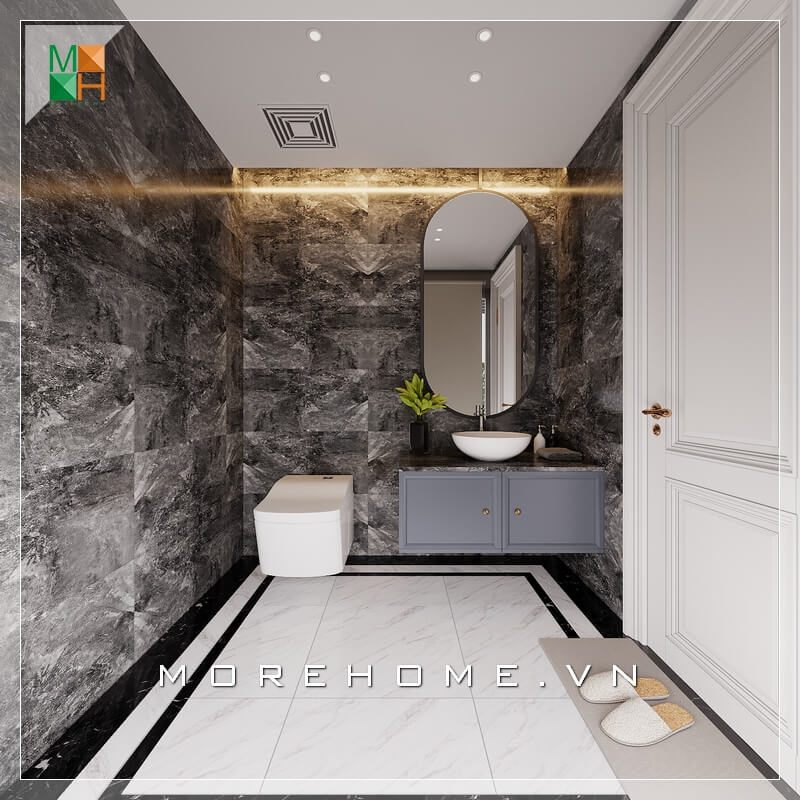 Sự sang trọng của không gian phòng tắm còn thể hiện ở đá lát sàn và ốp tường vân mây rất đẳng cấp.