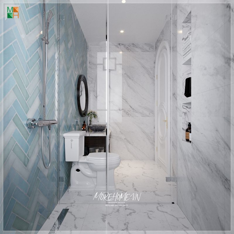 Do đặc thù phòng tắm luôn phải tiếp xúc với nước vì vậy thay bằng những bức tường trống trơn dễ thấm nước thì các gia chủ luôn lựa chọn đá ốp tường màu ghi nhạt.
