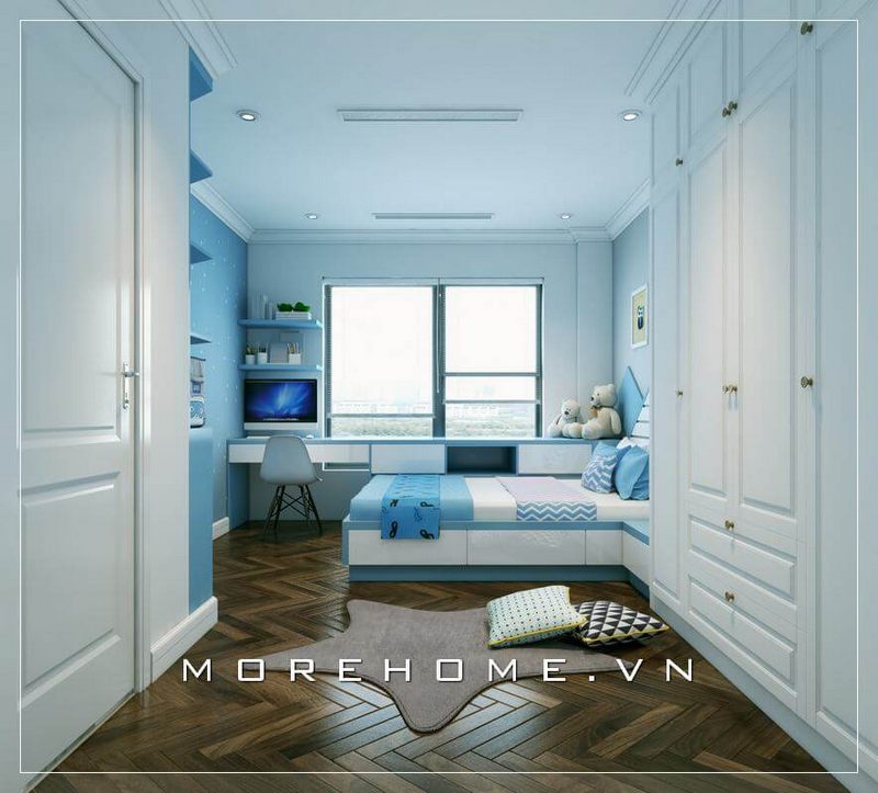 Nội thất phòng ngủ bé trai ấn tượng với gam màu trắng - xanh chủ đạo, đây cũng là gam màu được lựa chọn cho hầu hết không gian phòng ngủ bé trai tại chung cư, biệt thự, nhà phố...
