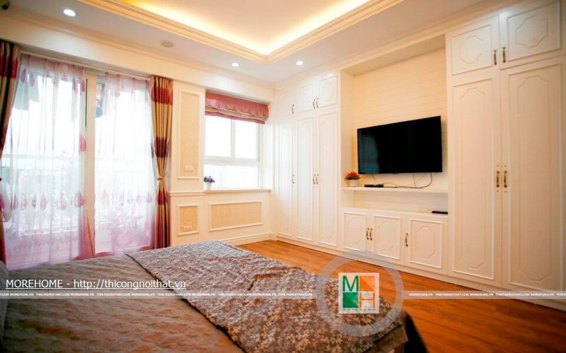 Không gian phòng ngủ đã trở nên gọn gàng hơn bao giờ hết với sự xuất hiện của hệ thống kệ tủ chạm trần.